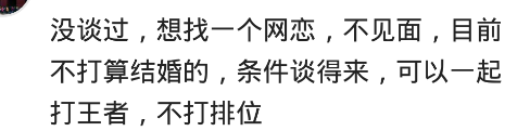 網友:沒談過,想找一個網戀,不見面,目前不打算結婚的,條件談得來,可以一起打王者,不打排位
