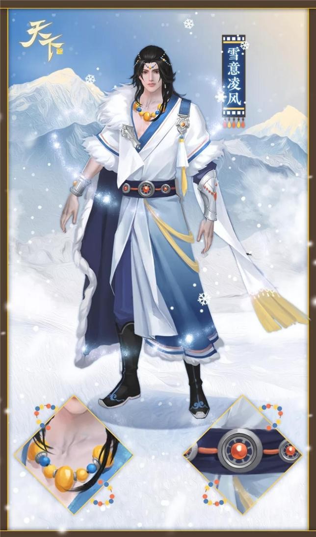 本次遊戲內上線的新時裝名為【雪意凌風】,先從男款講起:溫潤玉珠彼此串聯,一頭帶著幾分野性的長髮肆意落在雙肩,在山谷當中隨著寒風而飄動。再看衣著,右肩處一截深藍披風亦在凜風中獵獵而舞,襯出少俠之卓然氣質。左肩藍色飾帶垂下一綹明黃流蘇,有似明霞出雲,恰如冬日當中的一抹暖陽。藍白長袍似空明天宇下的皚皚雪峰,色調明麗,氣度不凡。再搭配上紅玉環繞的紫色腰封,以及隨風款擺的明黃袖擺,此時這股英氣流出,是如何阻擋也止之不住的。