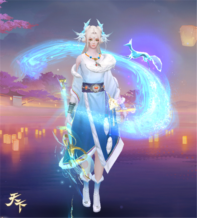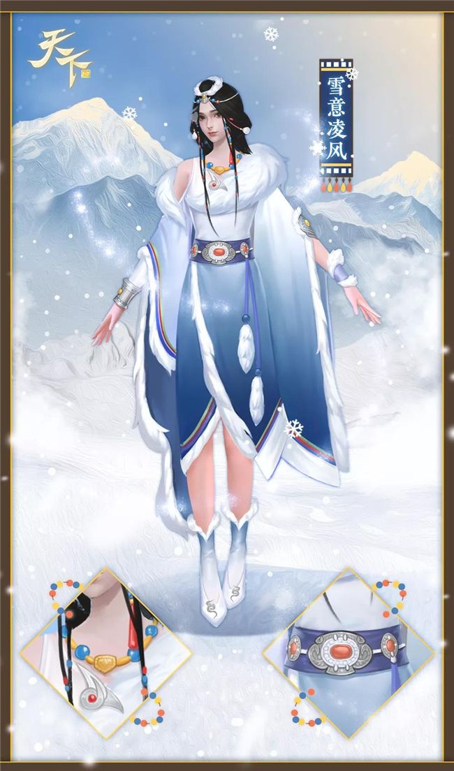 男款時裝既是這般大氣,女款同樣是秀外慧中。大家可以看到女款【雪意凌風】上面綴滿了華美精緻的珠玉頭飾,一頭及腰青絲徜徉在背,兩綹細發垂落胸前,雪山女子特有的溫潤委婉霎時就展現在了眼前。而在那柔軟蓬松的雪白圍脖下,以紅寶石腰封緊系了條藍白色漸變的長裙,更襯托出了少女的窈窕身段。