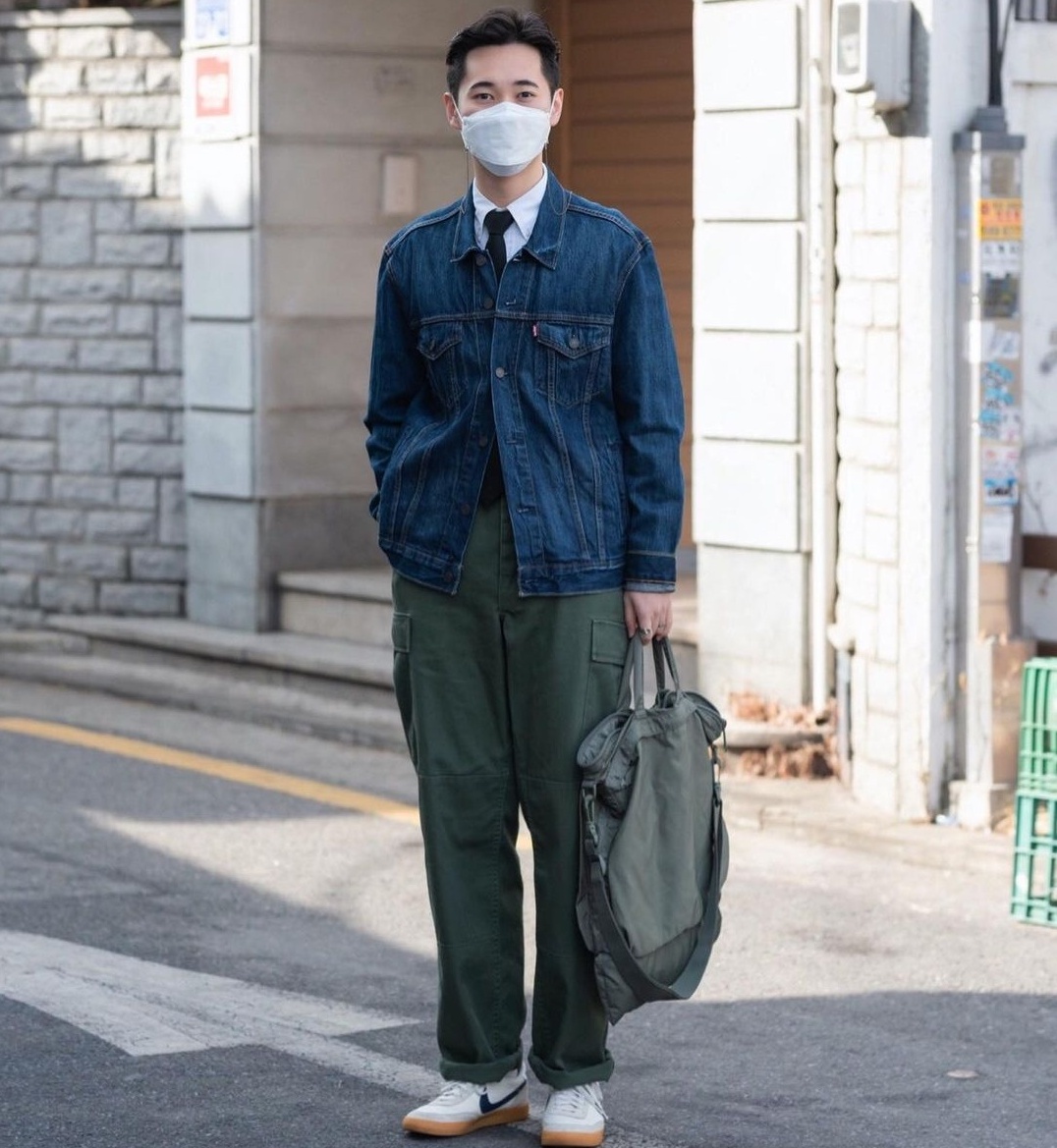 想要在初春穿出帥氣感,關鍵要看各種單品的搭配效果。選擇一件藍色的牛仔外套,硬朗又帥氣。裡面穿上一件白色的襯衫,並且打上黑色領帶,看起來特別斯文帥氣。褲子則選擇軍綠色的工裝褲,簡約而大氣。再穿一雙百搭的小白鞋,看起來雖然是混搭風,但是卻滿滿的陽光帥氣。