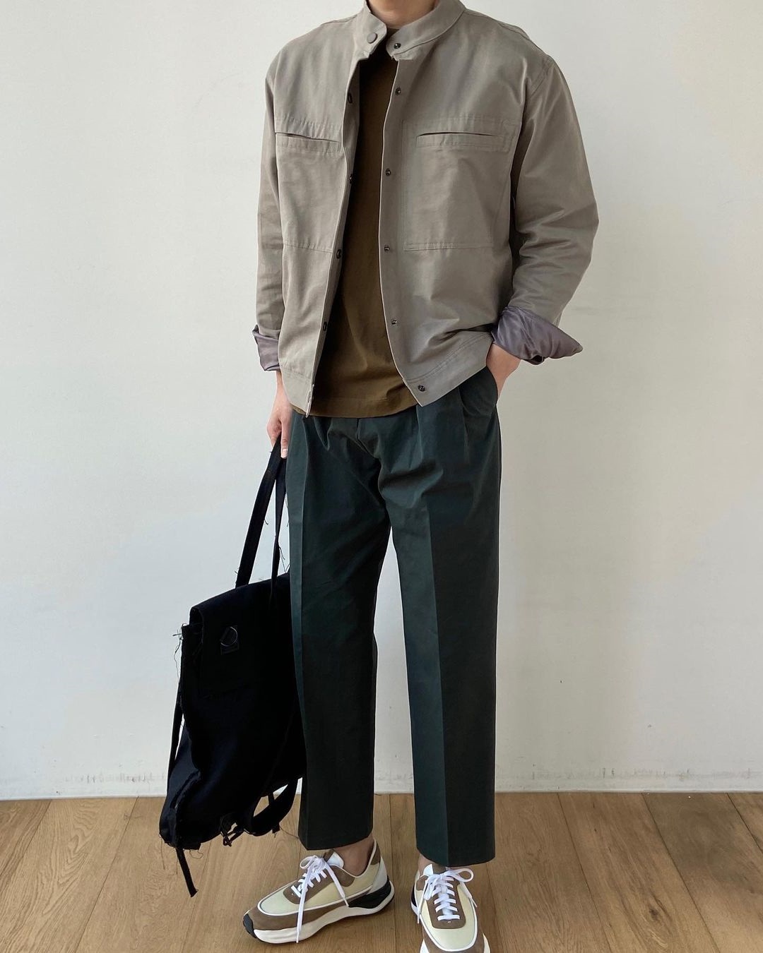 在初春的季節中,任何顏色都比不上綠色好看。選擇一件綠色的夾克,整體氣質看起來特別清新文藝,而且特別顯白。裡面穿一件連帽衛衣,保證保暖效果。褲子則是在去年大火的灰色運動褲,簡約時尚。黑色的休閒鞋,讓你看起來十分潮流。整體穿搭帥氣自然,滿滿的青春氣息。