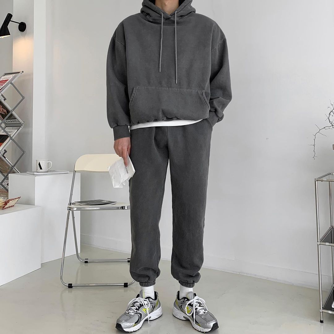 男生穿上套裝,不但特別顯年輕,而且能在視覺上增添你的身高。選擇深灰色的衛衣套裝,時尚又低調,連帽的款式,讓你可以在覺得冷的時候更能擋風禦寒。裡面穿一件白色的T恤,可以營造穿搭的層次感,使得這種套裝看起來不那麼單調。灰色的老爹鞋,也讓穿搭風格更加統一。