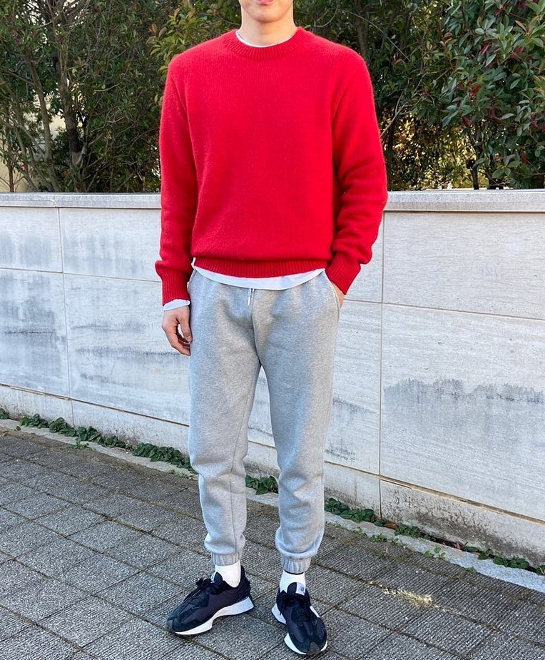 look2:紅色毛衣+白色長袖T恤+灰色束腳褲+黑色潮鞋