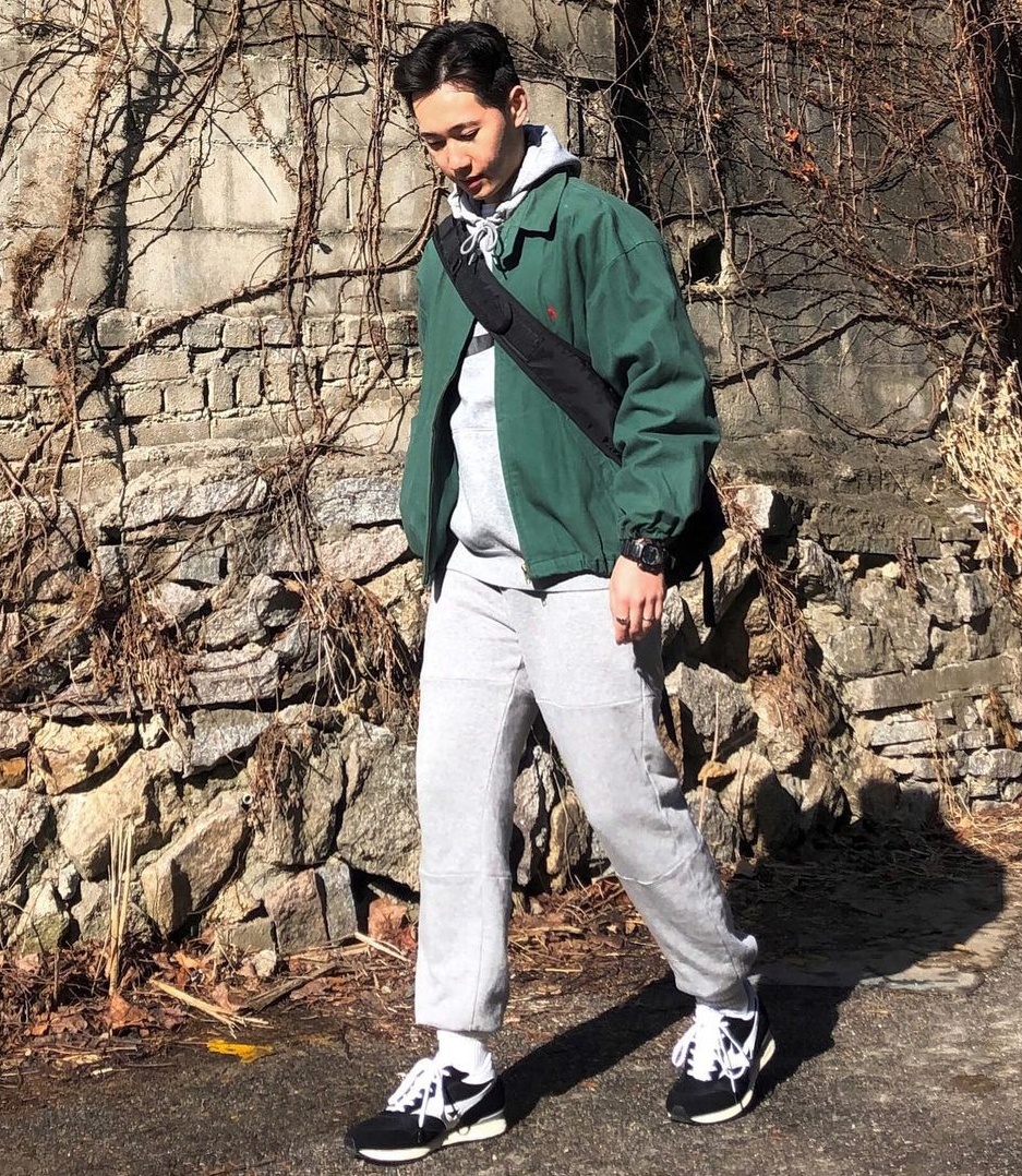 look6:綠色夾克+灰色衛衣+灰色運動褲+黑色休閒鞋