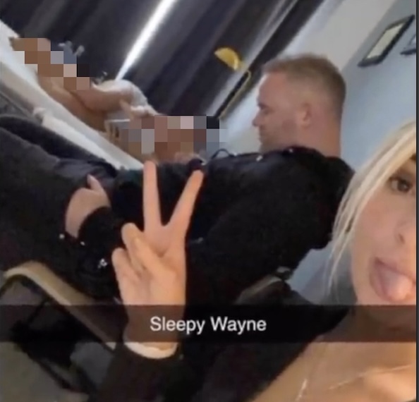 另一張照片則是一個女生在昏睡的魯尼身邊比劃「剪刀手」,不遠處的床上,躺著另一個只穿內衣的女孩,她們給這張照片加字幕為「熟睡的魯尼」。