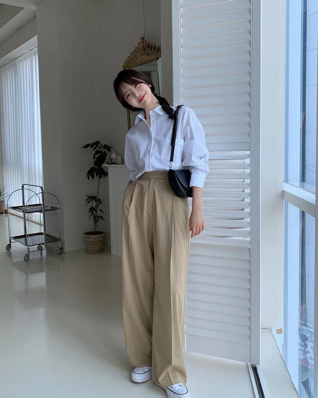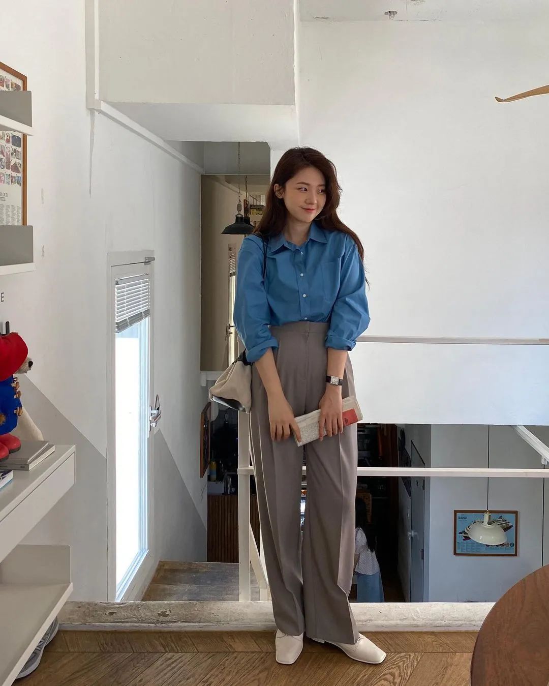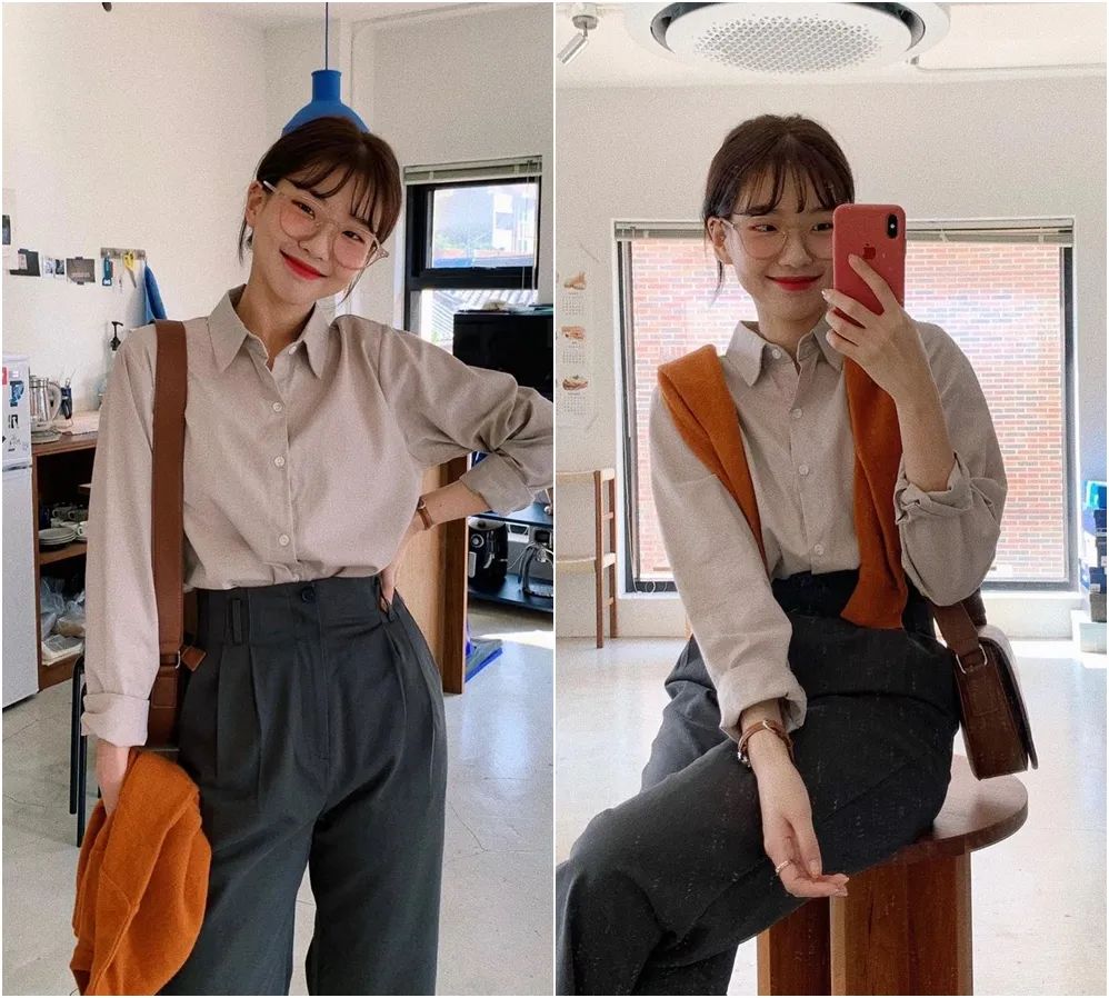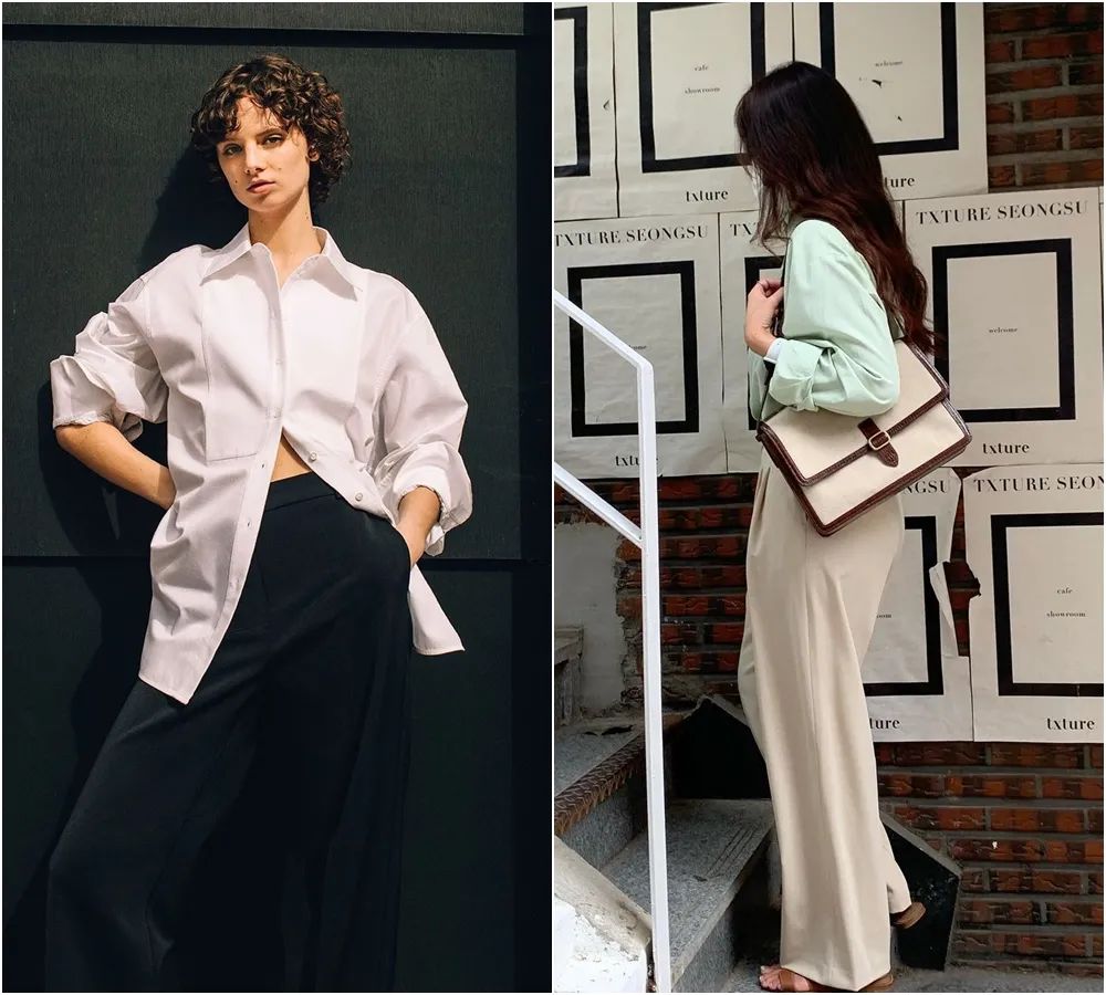 早秋比較常見的穿法,是襯衫+西裝闊腿褲。這個穿搭公式上班族可以直接整套照搬。▼