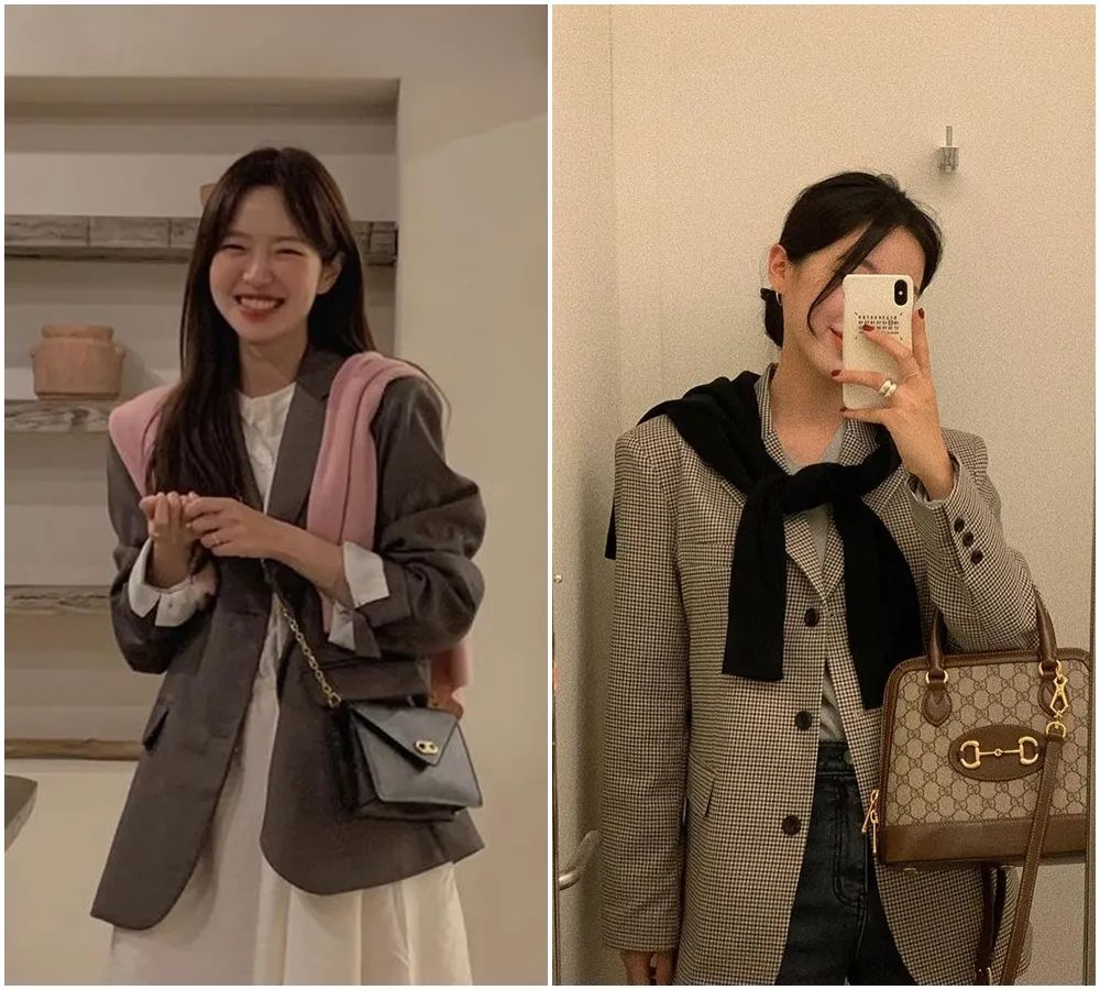而韓國博主們的穿搭大多會把它穿得隨性休閒一些,跟休閒感的T恤、牛仔褲搭得比較多。