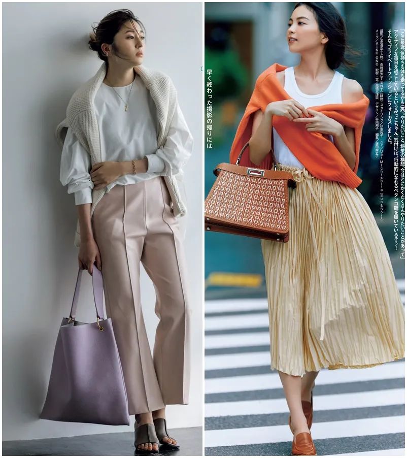 日雜的通勤OL風,下裝搭九分西裝褲或者是中長半裙比較多,整體是溫柔、知性的感覺。▼