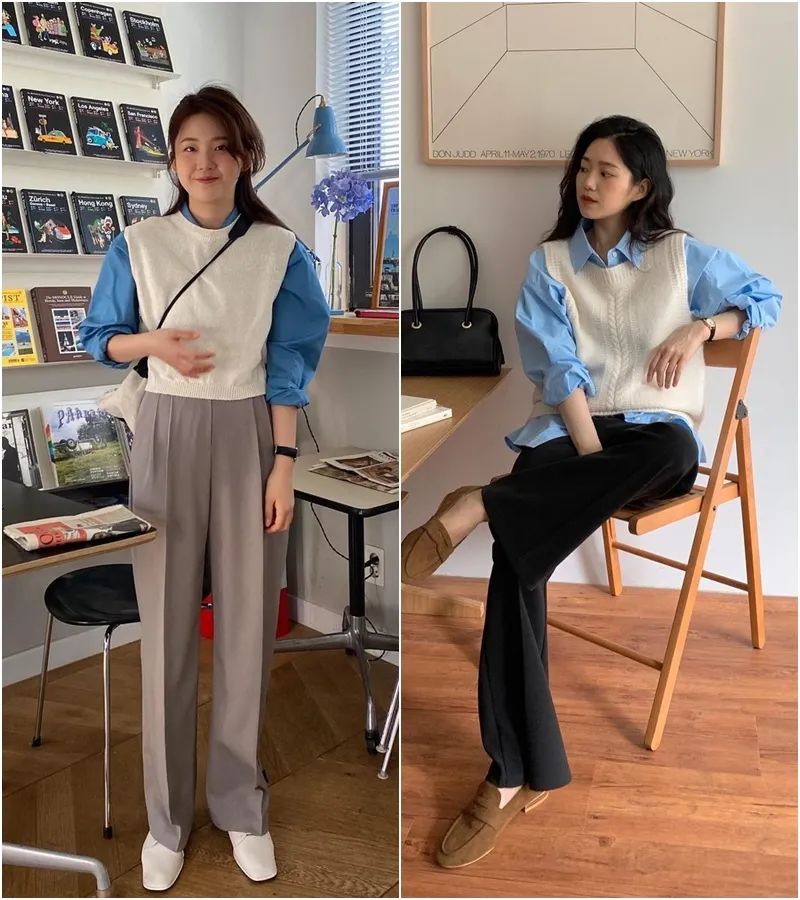 襯衫或者長T恤,加一件針織背心,層次感豐富一些,造型感也更強。▼