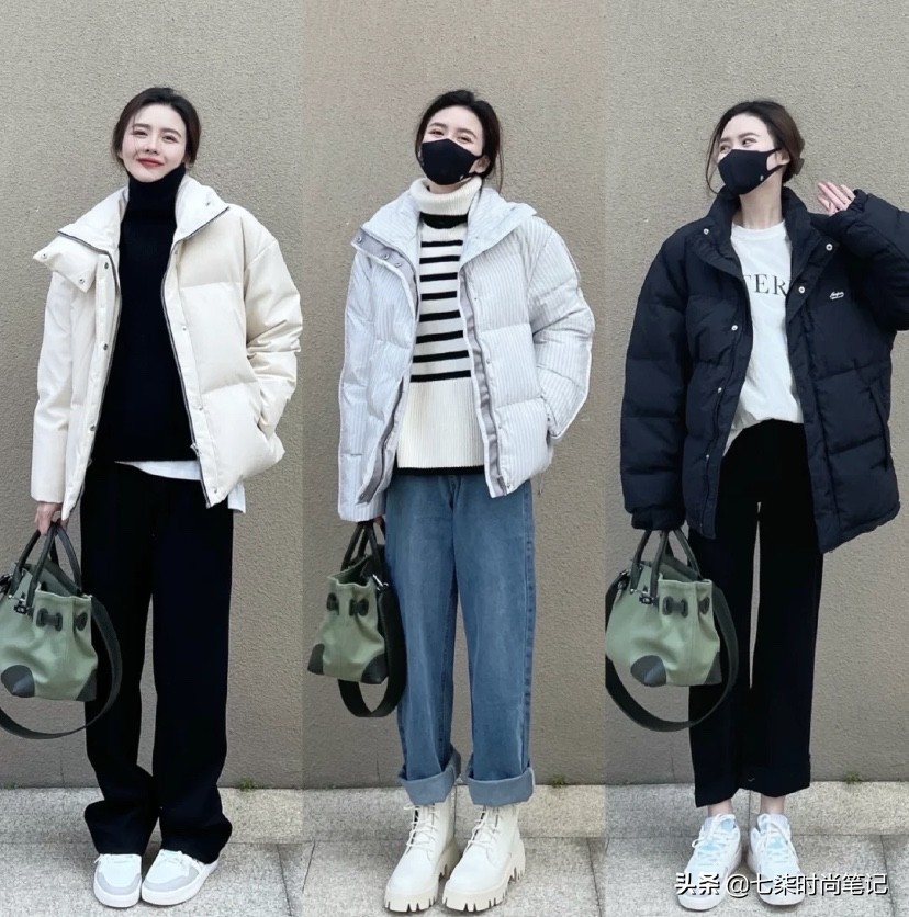 小個子女生如果擔心挑選不到適合自己的闊腿褲,也可以用直筒褲代替,如果褲腿比較長,那就挽起來一截,下面可以搭運動鞋,穿厚襪子,或者直接搭馬丁靴,用有份量感的鞋子來平衡羽絨服的蓬松度,能讓整體看起來更和諧。