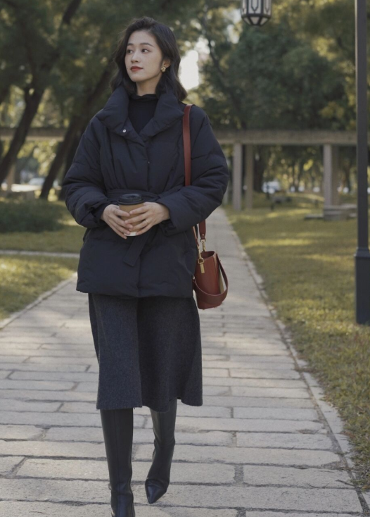半身裙和羽絨服的搭配組合充滿溫柔的氣質,並且大大提升你的女生味,再加上黑色的打底褲修飾下半身,也可以體現纖細的雙腿,身材比例看起來非常好呢。
