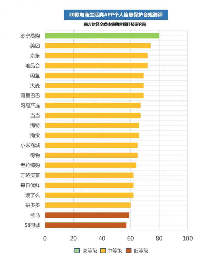 結合用戶量與功能差異等因素,測評選取了20款電商生活類APP進行個人資訊保護合規實測。測評結果顯示,蘇寧易購得分80分,個人資訊保護等級較高,美團、唯品會、京東、當當、網易嚴選、淘寶、餓了麼、拼多多等17款APP得分在60分至80分,盒馬、58同城得分不足60分。