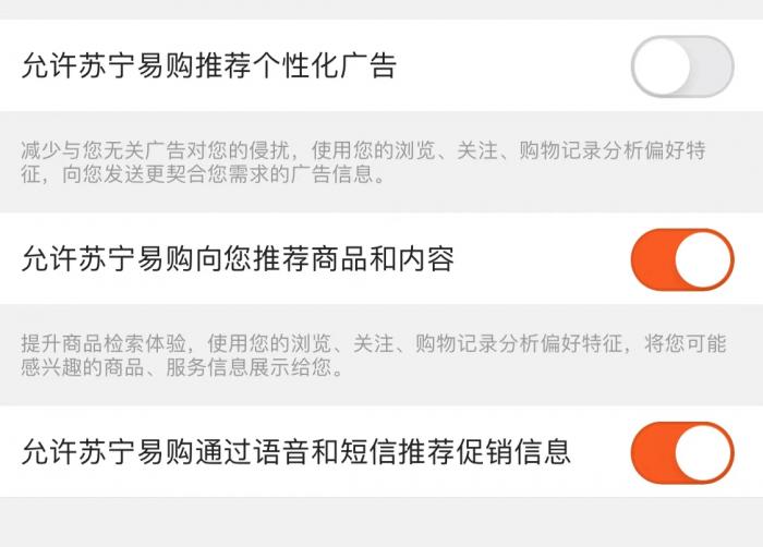 圖說:蘇寧易購區分關閉個性化內容與廣告推薦