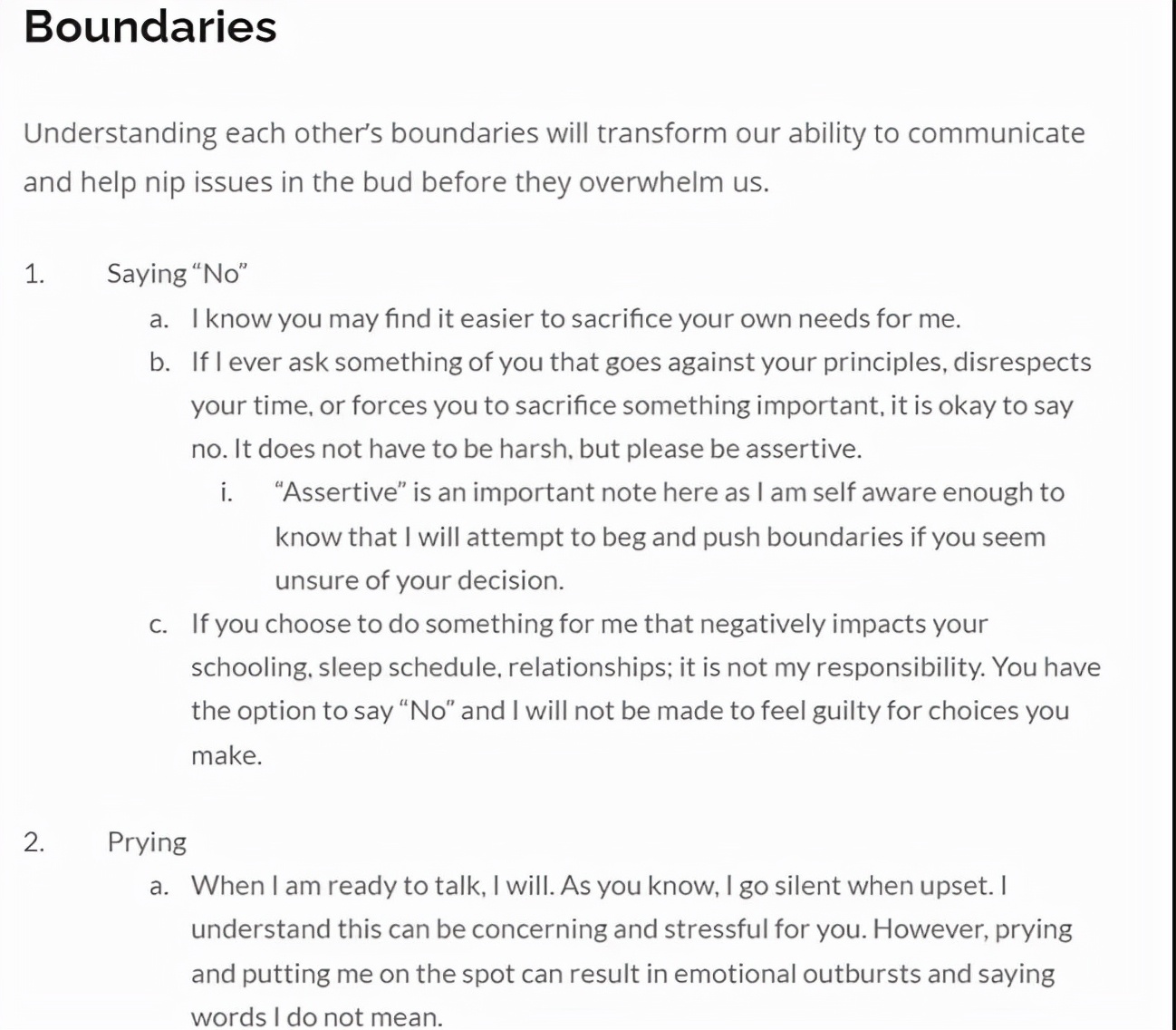 「我覺得我在上一段關係中遇到的最大問題是,感覺我的界限被越過了,而我從未建立過這種界限。」