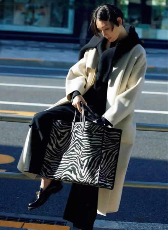 長長的米白色大衣,內裡是一身黑色休閒坐鎮,碩大的動物紋包包形成壓倒性的聚焦亮點,為風格造勢。熱烈激蕩,一改黑色的沉穩,成為矚目焦點。