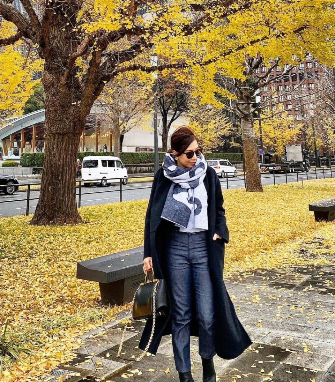 像這款圍巾採取的色塊比較大,看起來就很舒展,配合黑色長大衣以及黑色內搭,剛好能夠覆蓋於胸前的位置,打造出亮點。