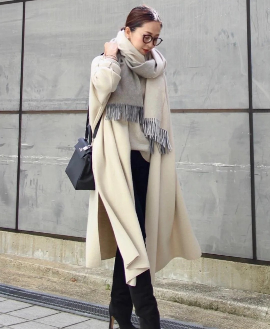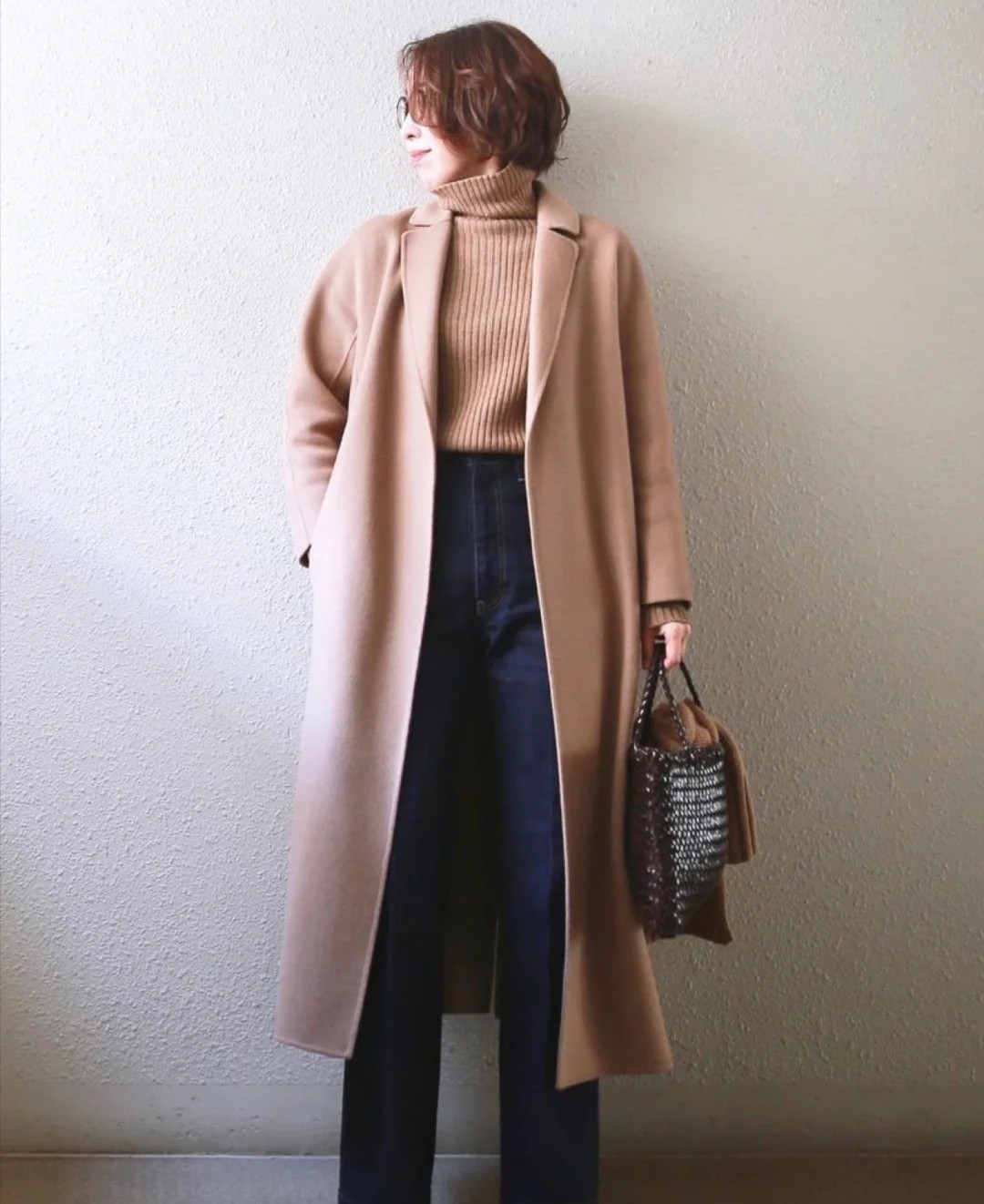 大衣的顏色應該保持多樣性,如果已經有了紫色的大衣,可以不必再另外準備和它風格類似的單品,而是要進行顏色方面的更換。以這款米白色的穿搭為例,它是白色的一種,只是相較於冷冷清清的白色而言,它的視覺呈現更加溫和,更容易展示出一種柔美的效果。