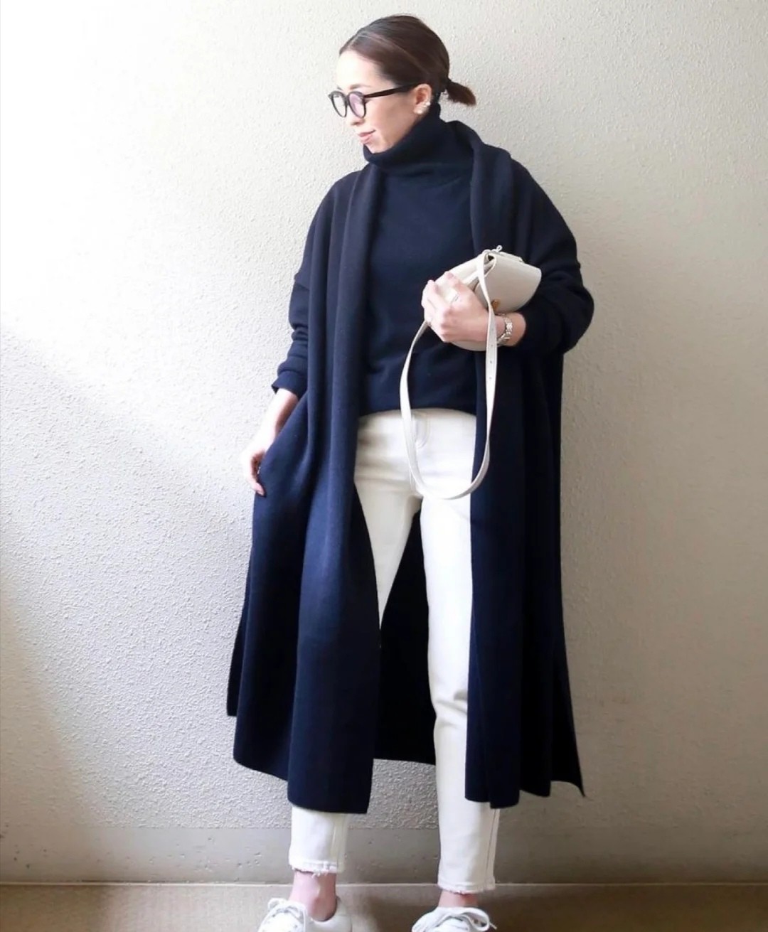 長款大衣的色彩選用很豐富,深藍色可以用來配合白色褲裝,這是一種打造出深淺結合的模式,既有成熟的魅力,又有清爽的風采,而且內搭與外套的大衣形成顏色的一致性,更有利於顏色的減少,來打造出最簡約的質感。