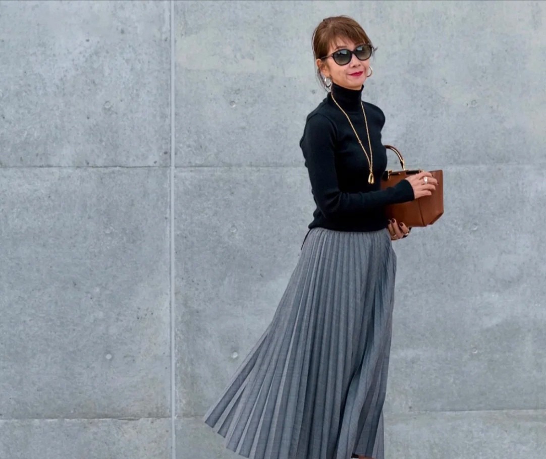 還可以記住內搭和下裝之間的配合公式,利用針織毛衣和半裙之間的互相組合,打造出優雅溫柔的效果。黑色針織毛衣修身與否,不是最重要的,但對呈現出來的身材線條有所影響。配合的半裙一定要有垂落感,像這款百褶半身裙,顏色簡約,配合黑色毛衣,大方又優雅。