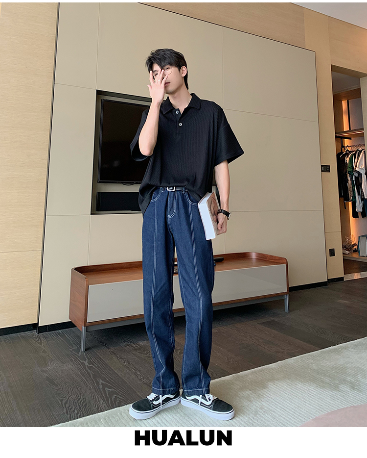 深色牛仔褲搭配的加入,採用的明線設計,