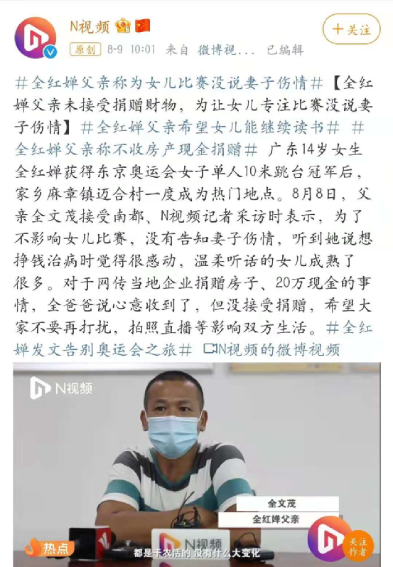 對此,全紅嬋父親澄清表明:大家的心是好的,心意也收到了,但並未接受任何捐贈,自己也不會消費女兒的榮譽,會靠自己幹農活賺錢。