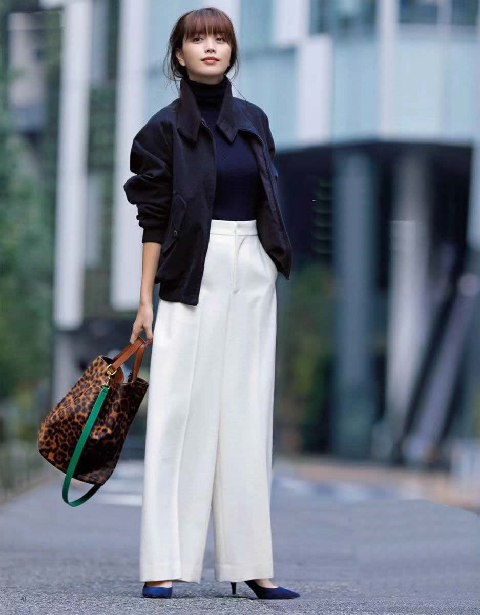例如這身造型,黑色的修身針織衫搭配白色高腰闊腿褲,將針織衫塞進長褲中,打造出優美的身材曲線,同時也能劃分出上短下長的身材比例。腳踩一雙寶石藍色的尖頭高跟鞋做為點綴,輕輕鬆松表達出女性的溫柔與嫵媚。