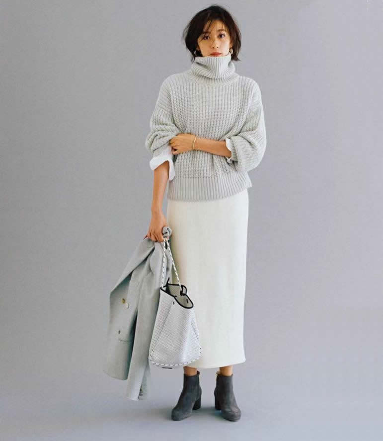 灰色與白色的結合,溫柔中又有著一絲距離感,相比一身白色帶來的個性與直接,灰與白的結合有了一種微妙的節奏感。淺灰色高領針織衫搭配白色的包臀裙,溫柔慵懶又能顯出女性的優雅氣質,既簡約又時尚。