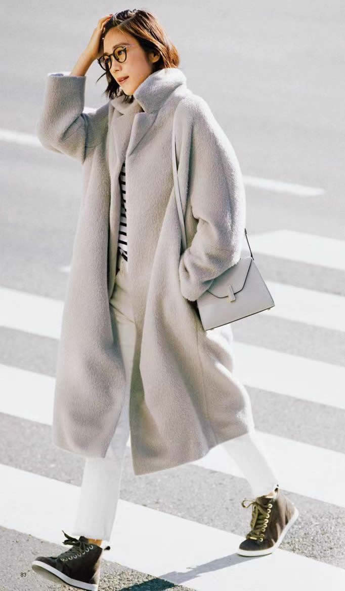 在大家的印象中,相比深色,淺色更加顯胖的特征,尤其是淺色毛絨材質的大衣會更顯胖。其實,往往淺淡的顏色塑造出的輕盈感更加明顯,深色調帶來的厚重感更加強烈。像這款淺灰色的毛絨大衣搭配黑白條紋衫加白色修身長褲,再穿上一雙綠色的帆布鞋,既休閒減齡,又時尚有品味。