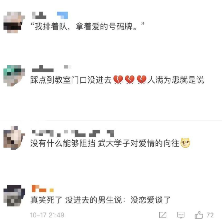 據了解,因當天聽課同學太多,教室內擠不下學生,有的學生在教室外爬窗聽課,更有學生自帶板凳翻窗進入教室。不少同學排著隊,拿著自己的號碼牌,感受了一場沉浸式談戀愛。