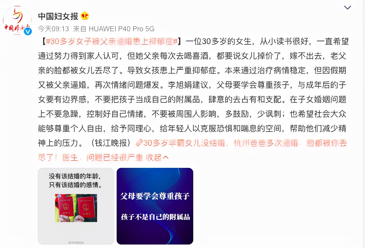最近,有一位30多歲的女子被自己父親逼婚逼出了憂鬱症。這個女生挺優秀的,從小讀書都很努力,先後考上杭州外國語學校和香港大學,她一直希望自己的努力可以得到家人的認可,但是讓她無奈的是什麼?每回她父親去喝喜酒回來,都會說她太掉價了,嫁不出去,還說老父親的臉都讓女兒給丟盡了。
