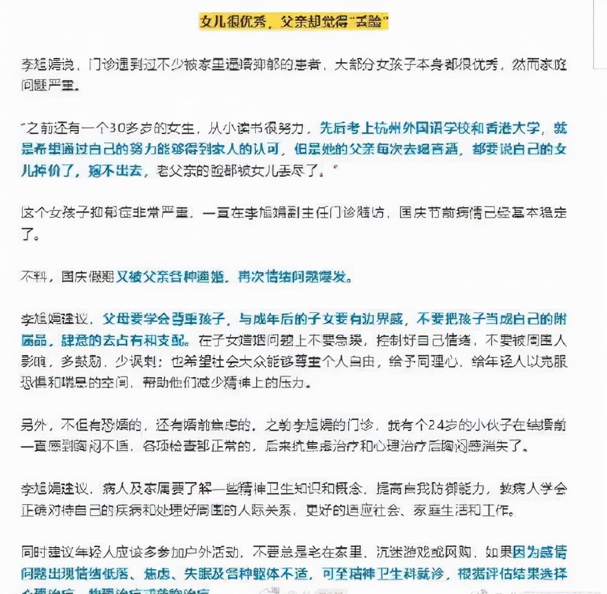 長期以來因為婚姻的事情跟父親的關係很為之緊張,女子壓力很大,憂鬱症非常嚴重,原本經過治療在國慶節前夕病情已經得到基本控制,可是隨著在國慶假期被父親各種逼婚,該女子的情緒又再次崩潰。