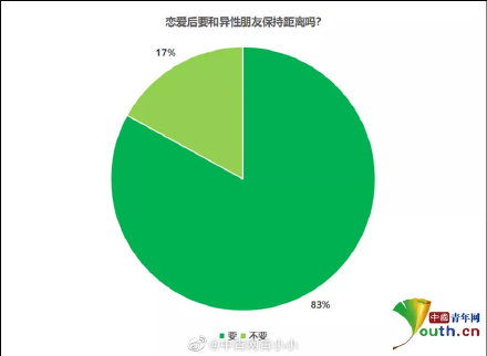 很多情侶在戀愛後,就會考慮要不要與自己的異性朋友保持距離。有人認為戀愛後,就要主動與異性朋友保持一定的距離感。最近,大陸青年網校園通訊社針對「戀愛後要不要和異性朋友保持距離」話題,面向全國907名大學生展開問卷調查,結果顯示:755名大學生認為要,占比83%;152名大學生認為不要,占比17%。戀愛後要和異性朋友保持距離嗎?