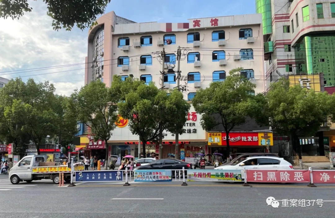 這條街算得上安福縣平都鎮最熱鬧的地方。即使在深夜,街邊的招牌依然閃亮。賓館在十字路口的東北角,上下六層,或是因為住宿一晚不過百元,常有徹夜不歸的「小年輕」留宿在此。