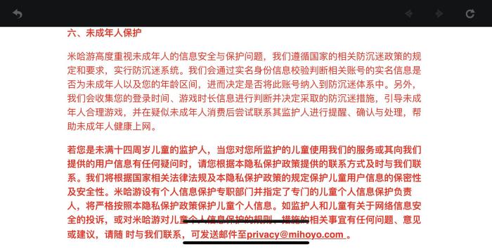 (圖說:《原神》APP內9月17日更新的隱私政策在未成年人保護章節中並未對如何保護未成年人的個人資訊作出具體說明。截圖時間為11月12日。)