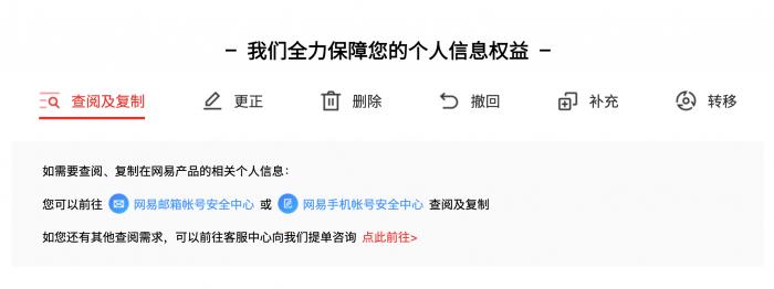 令人驚喜的是,合規科技研究員在實際測評過程中發現,受測手遊類APP所屬的公司中,網易、騰訊、阿裡特別設置了獨立的個人資訊保護平臺,即用戶可以在專屬的平臺網頁上尋找單一APP的隱私政策。在網易提供的個人資訊保護平臺中,向用戶提供了查閱、復制、撤回、轉移等處理個人資訊方式的操作路徑以及咨詢的聯絡方式。