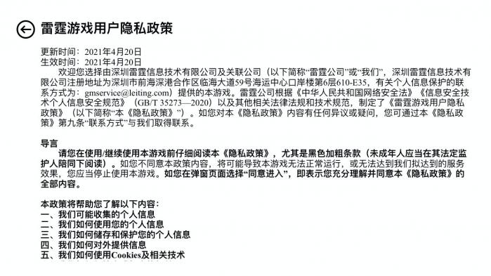 (圖說:摩爾莊園內的《雷霆遊戲用戶隱私政策》更新和生效時間為2021年4月20日。截圖時間為11月10日。)