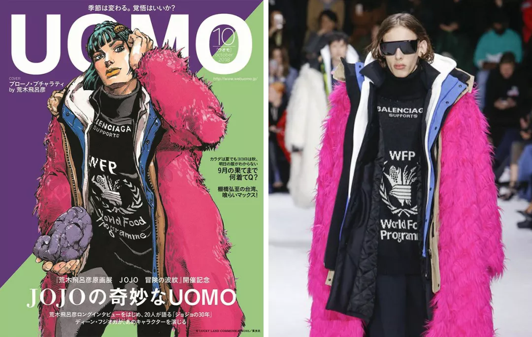 荒木飛呂彥讓第五部中的人氣角色布加拉提穿著大熱的 BALENCIAGA 18A 時裝, 登上了《UOMO》雜誌 10 月刊的封面。▼