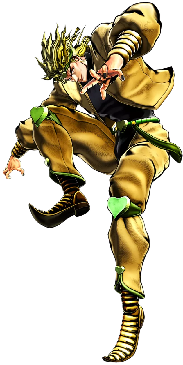 而作為反派時尚代表,第三部中的 Dio 一身金黃鮮綠,寬鬆的七分袖外套,小清新鳳梨褲外加心形護膝,再搭配優雅的尖頭踝靴……