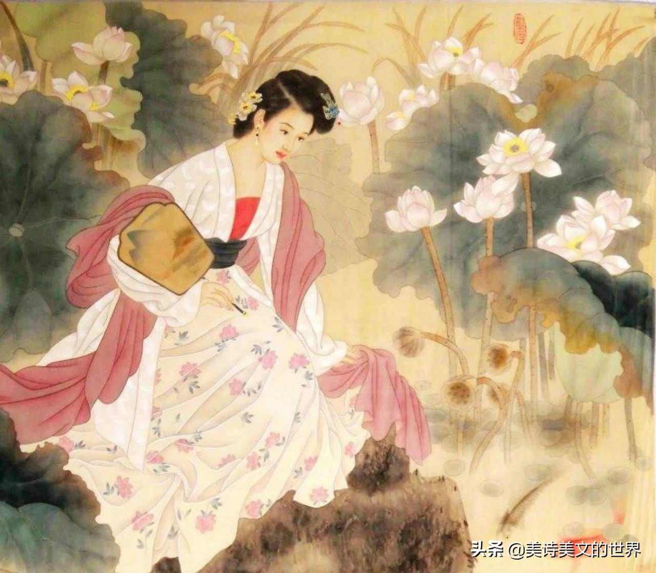 這首詩描繪的一對江南采蓮女的故事。江南采蓮時節,男女傾巢而出,好不熱鬧,美麗大方的采蓮女成了不少古詩的主角。