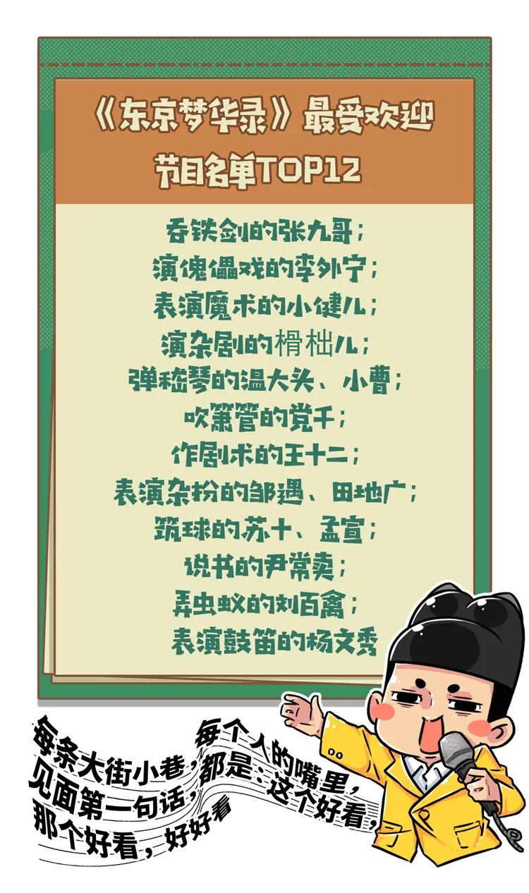 雜技、魔術、說唱、雜劇、蹴踘、猴戲、猜燈謎