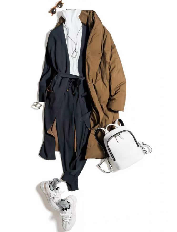 而內搭呢?帥氣的黑色西服套裝與一件白色高領衫足夠了!用流線型長項鏈點綴其間,白色休閒鞋與雙肩包呼應,一套兼具正式與休閒的混搭行頭應運而生。