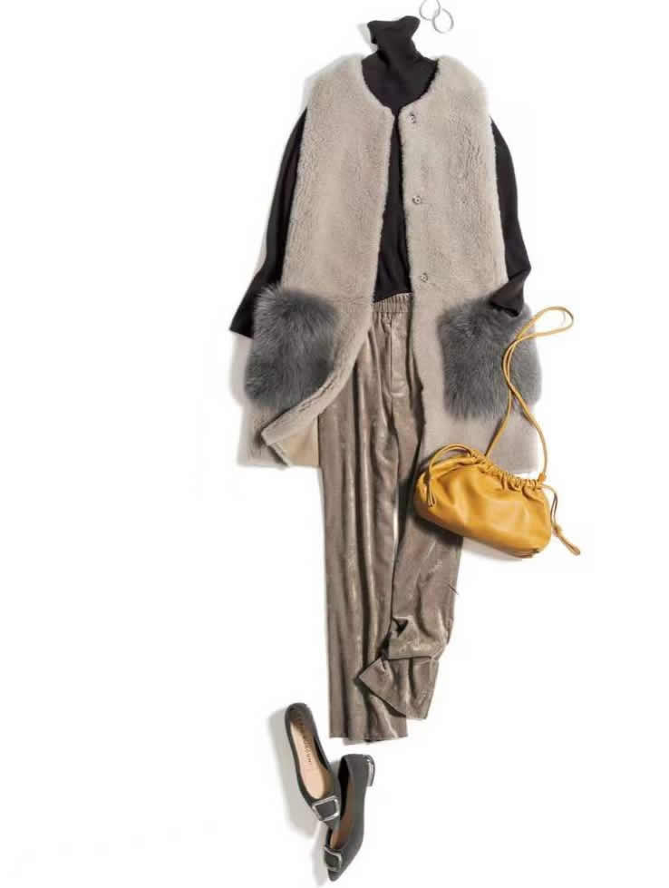 例如,細膩講究的皮草,光澤緞面,精細羊絨,華美蕾絲褶皺,精良網紗等等。這套搭配中,米色皮毛馬甲是華麗的主角,而同色系的搭配手法將這份華麗捧到極致。