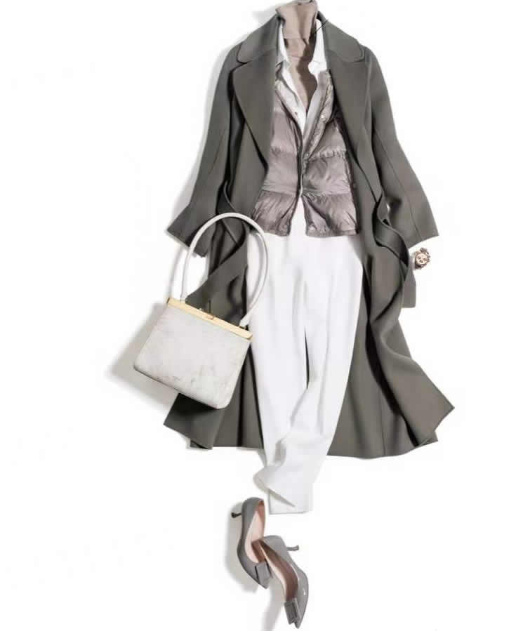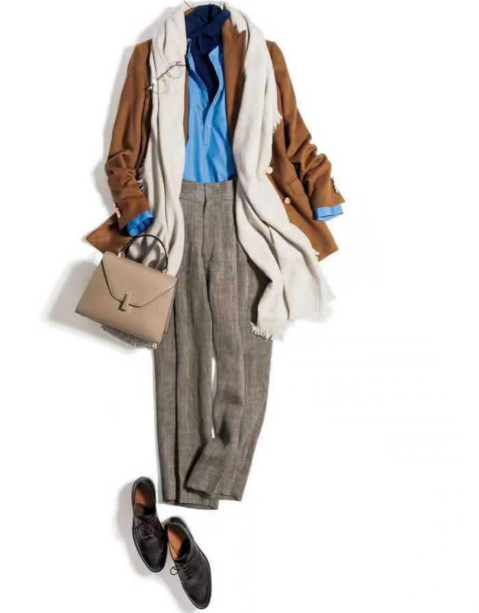 灰褐色羊毛直筒褲,順延著棕色同色系的和諧氣氛,同時承擔著帥氣利落的調和。一條米色長圍巾的瀟灑點綴,滿足冬日想要的一切穿衣訴求。