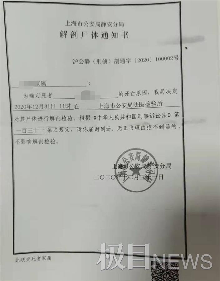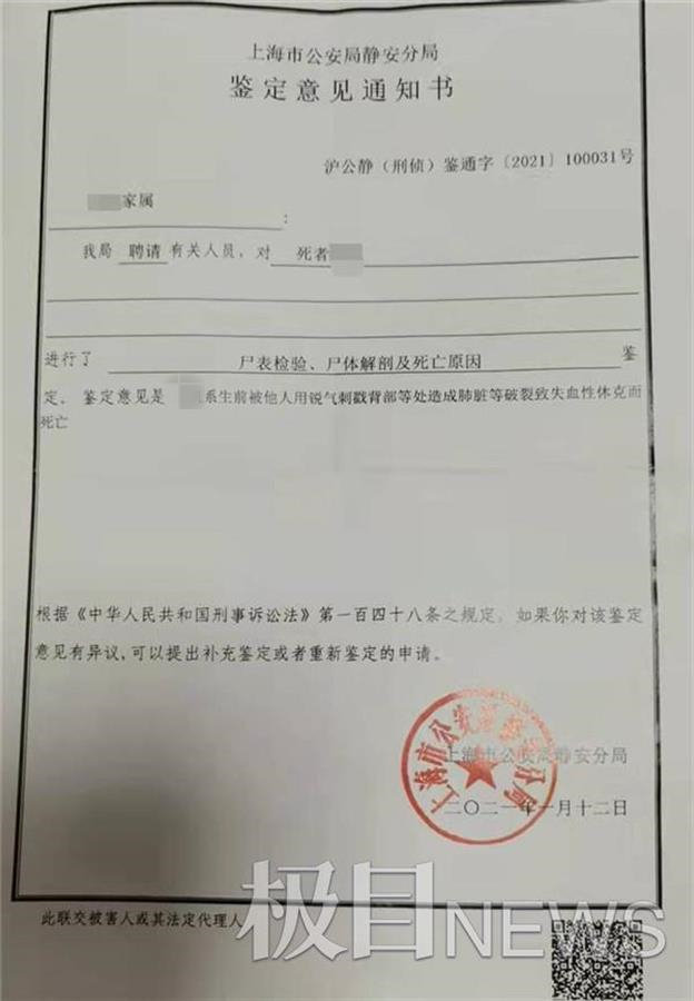 2021年1月13日,魯賢強和親屬再次來到上海。上海警方提供的《上海市警察局靜安分局鑒定意見通知書》顯示,該局聘請有關人員,對死者魯錚進行了屍表查驗、屍體解剖及死亡原因鑒定。鑒定意見是,魯錚系生前被他人用銳器刺戳背部等處,造成肺臟等破裂,致失血性休克而死亡。