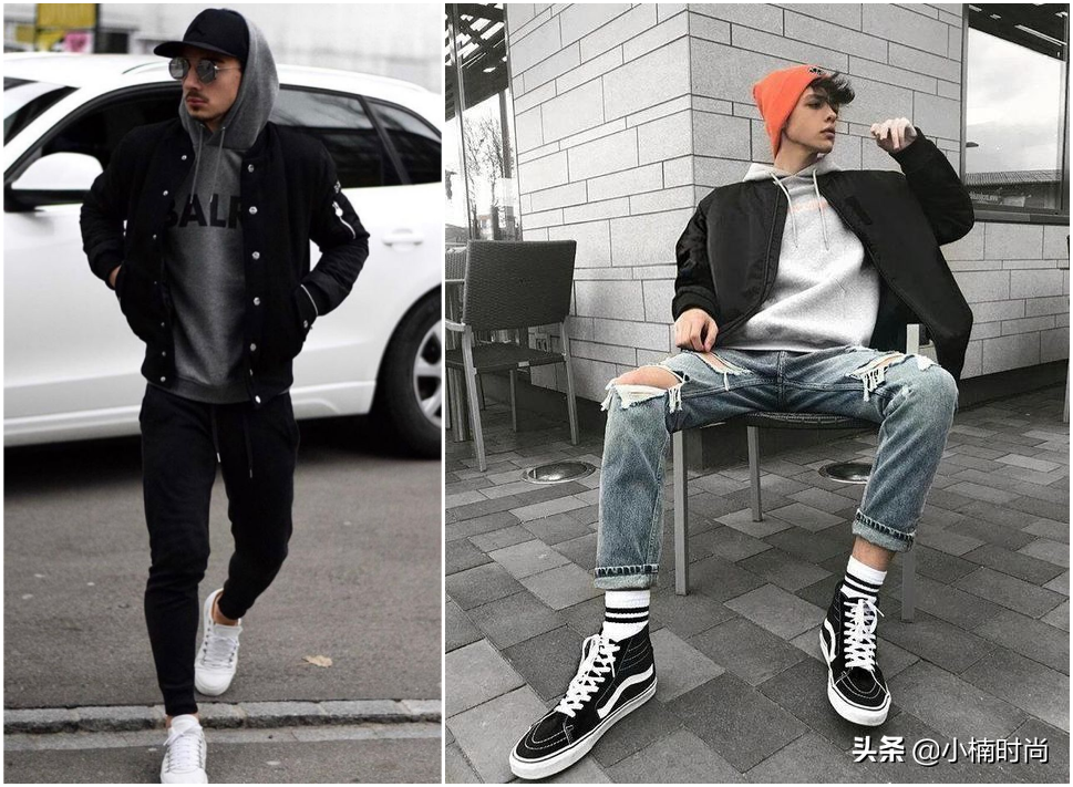 飛行員夾克內搭連帽衛衣可以穿出復古休閒感,保暖同時不至於臃腫。如果覺得整套搭配過於單調,可以通過內搭的印花字母或者選擇一件亮眼配飾來調整適配。