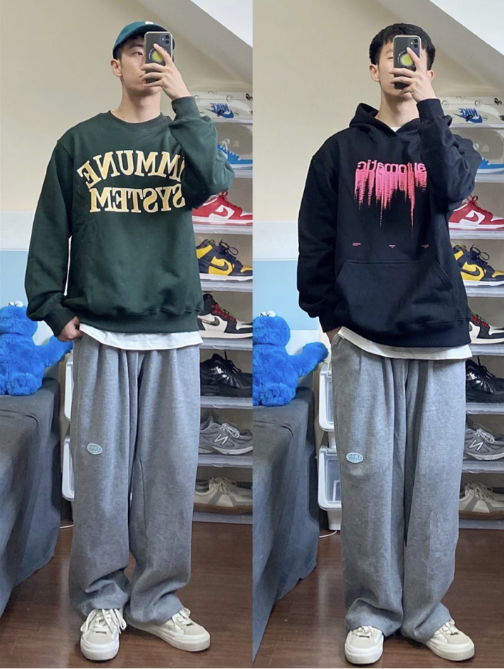 不管是純色衛衣還是有元素修飾的形式,內搭白色T恤,露出的一個邊邊都很吸引人,既能塑造出疊穿的形式,還不會顯得很臃腫,搭配灰色的運動褲,活力滿滿。