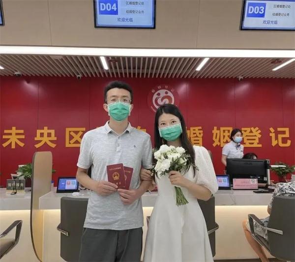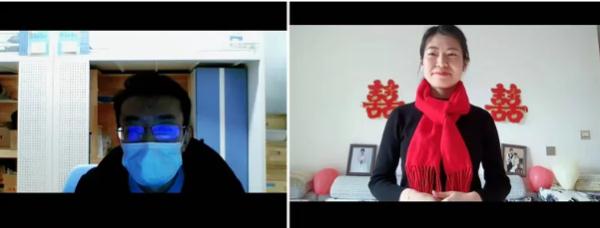 新娘何飛飛戴著喜慶的大紅圍巾在家