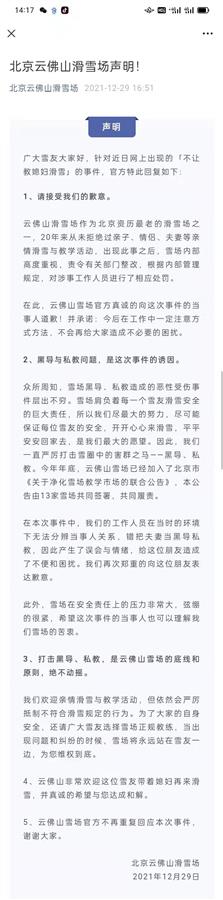 雲佛山滑雪場12月29日曾在其Line公眾號發布聲明稱,工作人員在當時的環境下無法分辨當事人關係,錯把夫妻當做了黑導私教,因此產生了誤會與情緒,給韋先生造成了不便和困擾,現已經對涉事工作人員進行了處罰,並向當事人道歉。聲明中還表示,雪場歡迎親情滑雪與教學活動,但依然會抵制不符合滑雪規定的行為。建議為了自身安全,選擇雪場正規教練教學。