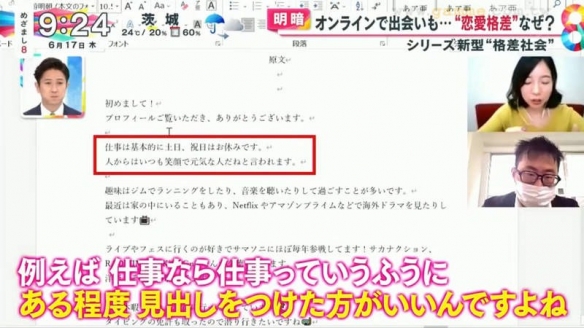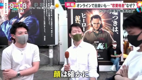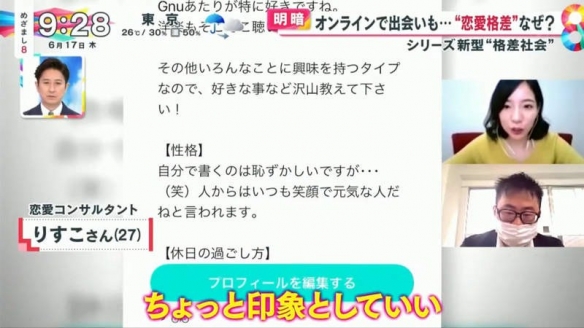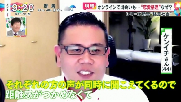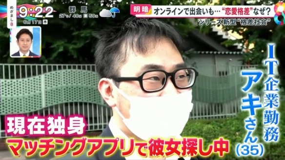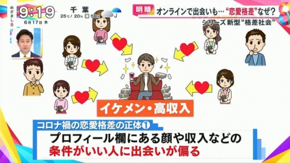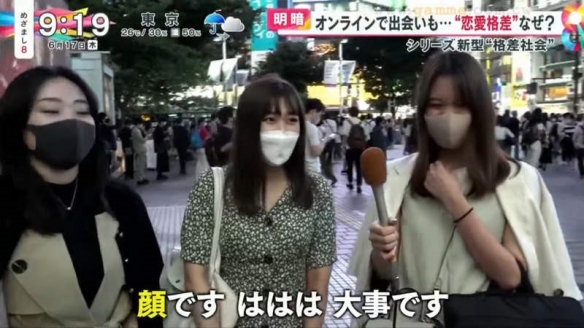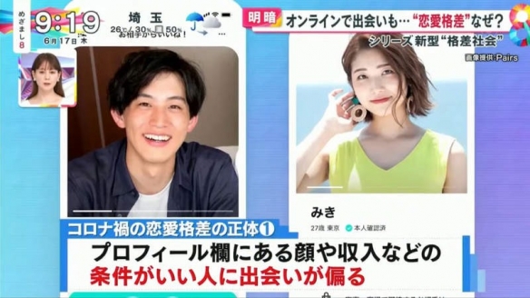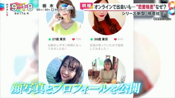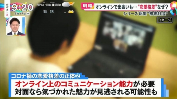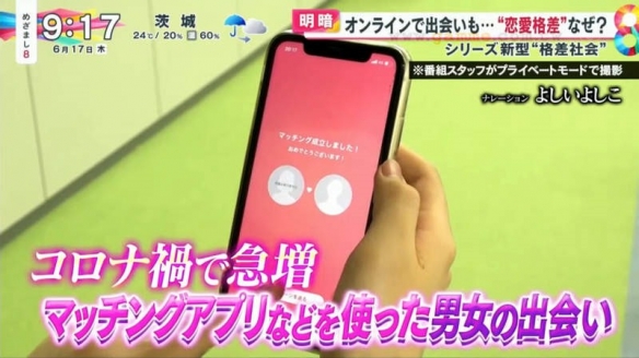 日本富士電視臺的晨間情報節目「めざまし8」就探討起現實戀愛與網戀的差距。原因在於疫情之下,人們大量使用交友軟體,同時也有很多人遭遇前所未有的挫折。
