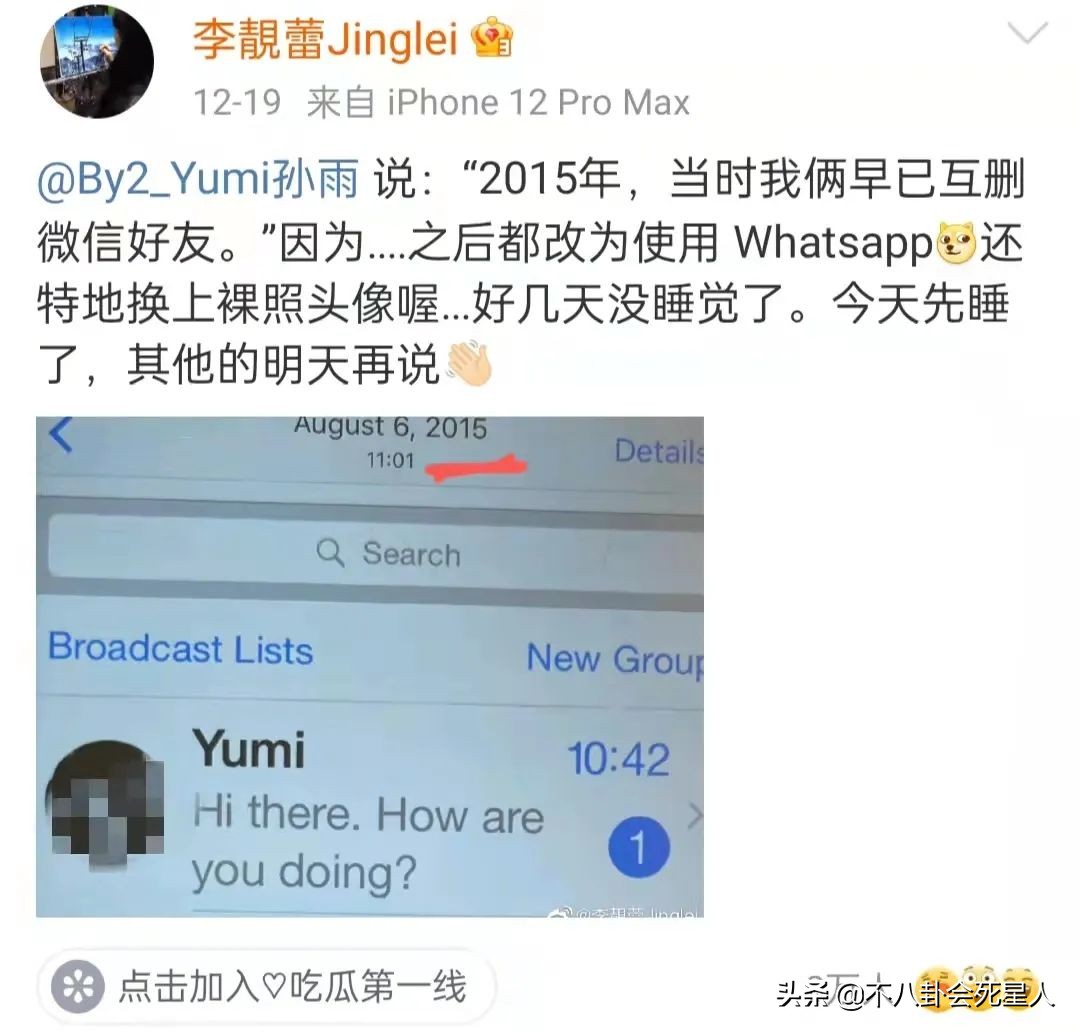 李靚蕾直接放出圖片,表示孫雨確實刪了Line,只是改用了whatsapp,還換了很開放的頭像,這個實錘直接打臉孫雨。